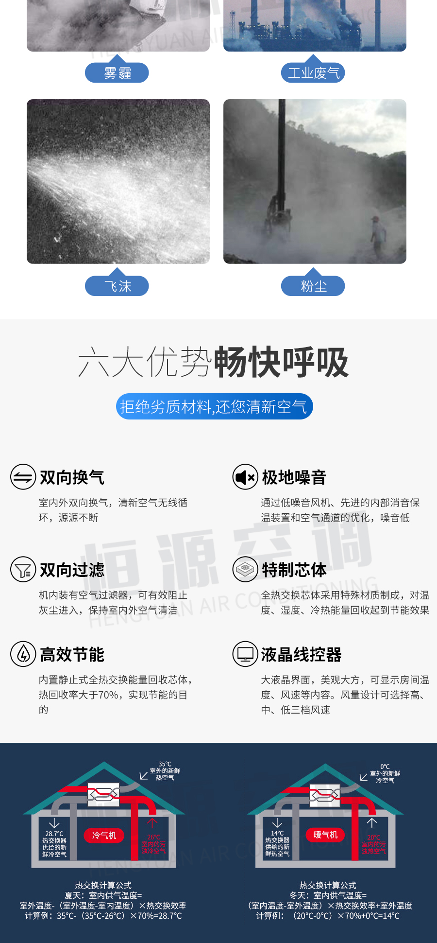 靖江市恒源空調設備制造有限公司——新風換氣機是根據在密閉的室內一側送風另一側引風,則在室內會形成“新風流動場”的原理進行設計研制的。它依靠機械送風、引風,強迫在系統內形成新風流動場。是一種時刻保持室內空氣潔凈清新的新型環保電器。這種獨立的室內空氣置換、凈化循環系統,能在排除室內的污染空氣的同時,輸入自然新鮮空氣,將輸入室內的新風先經過濾、殺菌、加熱、增氧等多項處理。